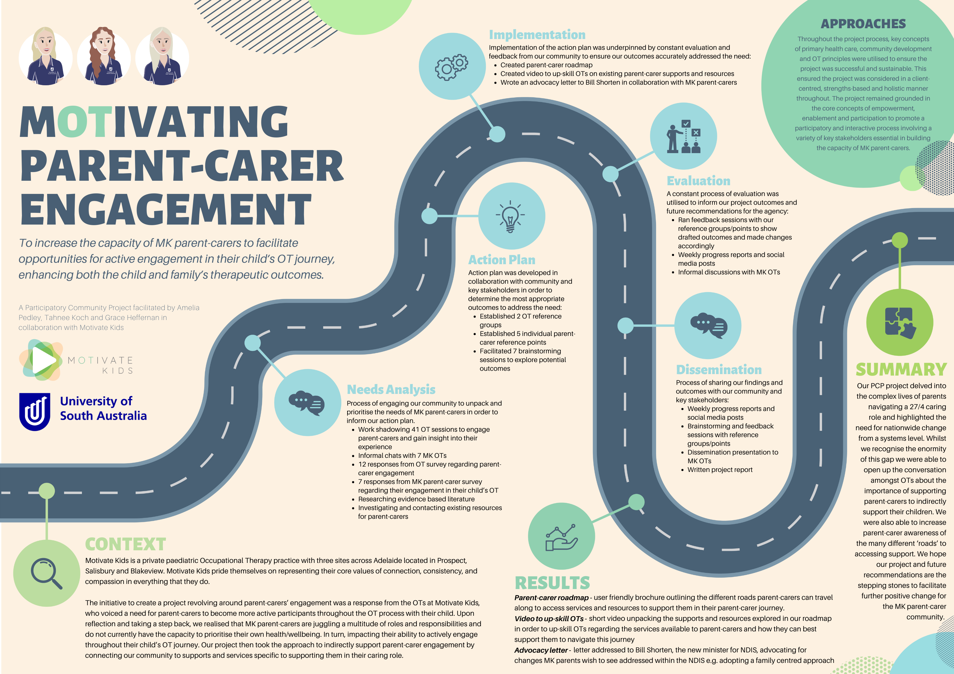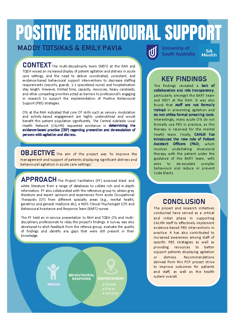 The award-winning posters are reproduced in full. They represent significant learning journeys by students and provide impressive demonstrations of their contributions to the occupational therapy practice community. The posters cover a wide range of topics, from "Developing Collegial Culture" to "Wheelchair Rugby". For example, Pedley et al's project delved into the complex lives of parent-carers navigating a 24/7 caring role, highlighting the need for nationwide systemic change. These students not only developed a poster, but also developed a video for parents and wrote a letter to the minister, advocating for better services. Tstoskas and Paira's poster on "Positive Behavioural Support" tells a compelling story of how their project served as a catalyst during a critical initial phase, which led to the employment of Patient Assistant Officers trained to de-escalate complex behaviors.